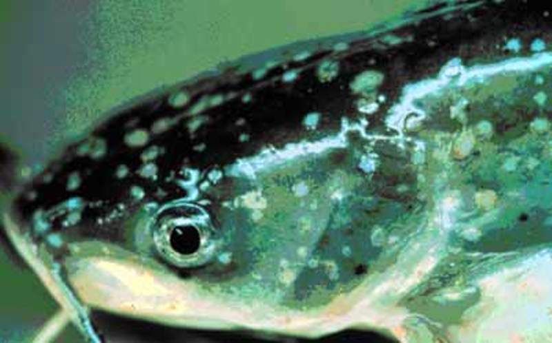 நோய் தாக்கப்பட்ட மீன்களின் தலை மற்றும் உடலின் மேல் வெள்ளை மற்றும் சிவப்பு நிறப்புள்ளிகள் தோன்றி பின்னர் அவை அளவில் பெரியதாகும்.