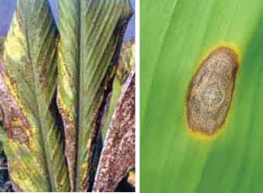 பயிர் நட்ட 40-45 நாள்களுக்குப் பிறகு தோன்றும் இந்த நோய், ஈரமான பருவ நிலையில் தீவிரமாகப் பரவுகிறது. கருமை நிறவளையங்களை உள்புறமாகக் கொண்ட பழுப்பு நிற புள்ளிகள், இலையின் மேல் பரப்பில் காணப்படும். இளம் மற்றும் முதிர்ச்சியடைந்த செடிகளில் வெவ்வேறு அளவுகளில் புள்ளிகள் காணப்படும். முதலில் சாம்பல் நிற உள்புறத்தைக் கொண்ட நீள வடிவப் புள்ளிகளாகத் தோன்றும்.