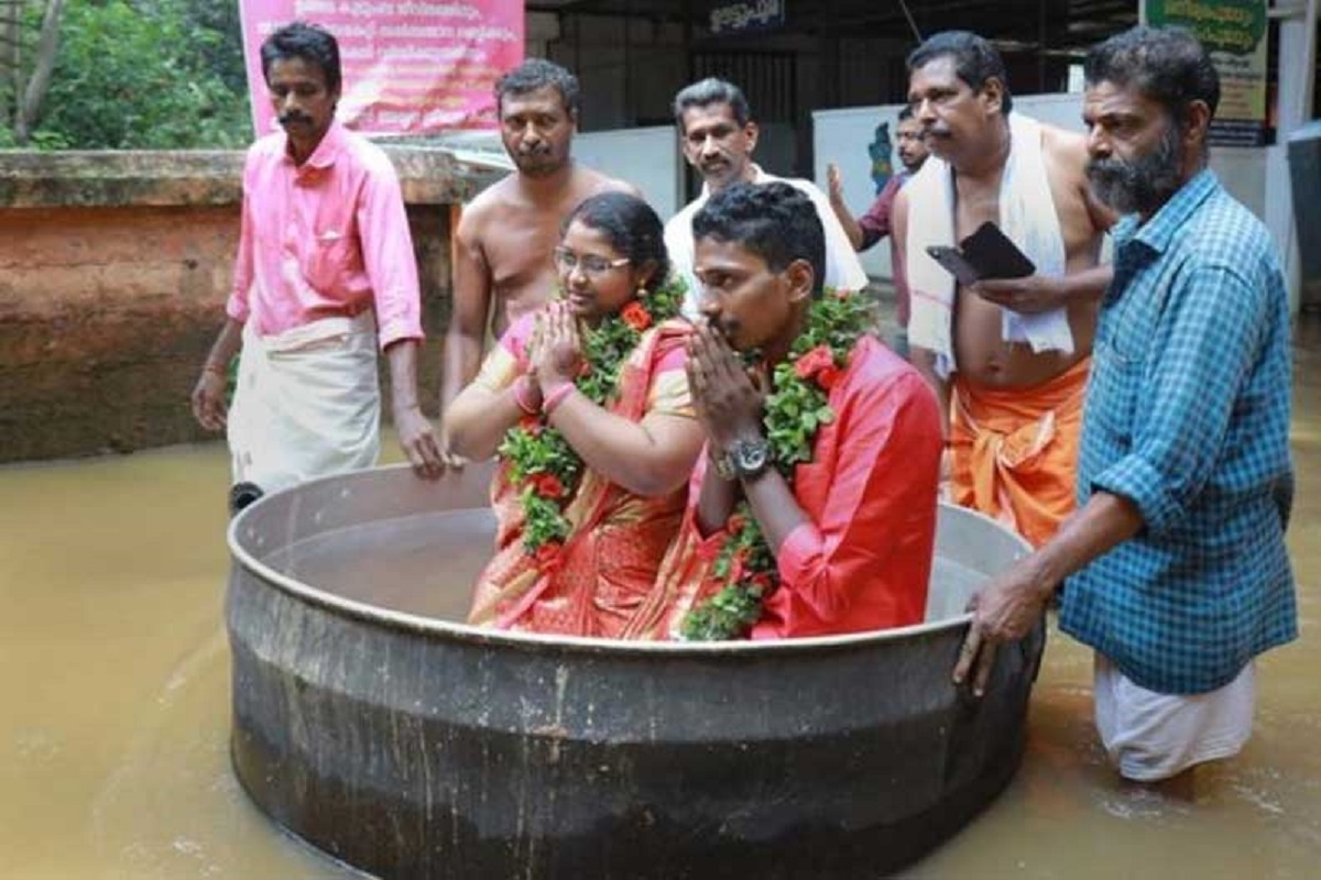 கேரளாவில் வெள்ளம் சூழ்ந்த நிலையில் சமையல் பாத்திரம் ஒன்றைப் படகாகப் பயன்படுத்தி இளம் காதல் ஜோடி திருமண மண்டபத்திற்குச் சென்று திருமணம் செய்துகொண்டது அனைவரையும் வியப்பில் ஆழ்த்தியது.