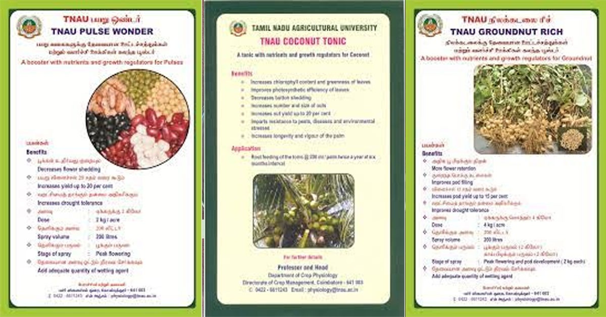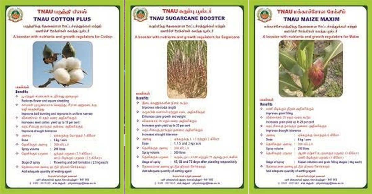 விவசாயிகளின் நலனை கருத்தில் கொண்டு தமிழக வேளாண்மை பல்கலைக் கழகத்தில் பயறு வகைகள் நிலக்கடலை பருத்தி கரும்பு மற்றும் மக்காச்சோளம் பொன்றவற்றில் விளைச்சலை அதிகரிக்க ஊட்டச்சத்து டானிக் உற்பத்தி செய்கிறது. இந்த டானிக்கில் பயிருக்குத் தேவையான ஊட்டச்சத்துக்கள் மற்றும் வளர்ச்சி ஊக்கிகள் அடங்கியயுள்ளன. ஊட்டச்சத்து டானிக்கை இலை வாரியாக தெளித்து விளைச்சலை அதிகரிக்கலாம்.