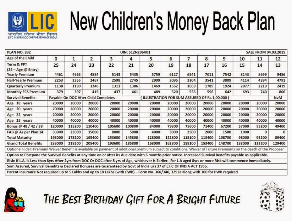 குழந்தைகளுக்கு என்று அறிமுகம் செய்யப்பட்டுள்ள (LIC New children moneyback plan) புதிய பாலிசி திட்டத்துக்கு வயது வரம்பு 0 முதல் 12 வயது ஆகும் (வயதுக்கு தகுந்தாற் போல் பாலிசி தொகை வேறுபடும்). பாலிசி காலம் 25 வருடங்கள். குறைந்தபட்ச காப்பீட்டு தொகை ரூ.1 லட்சம் ஆகும். குழந்தை வளர்ந்து 18, 20 மற்றும் 22 வயதுகள் அடையும் போது காப்பீட்டு தொகையில் இருந்து 20 சதவீதம் வழங்கப்படும். முதிர்வு காலத்தில் காப்பீட்டு தொகையின் 40 சதவீதம் மற்றும் போனஸ் வழங்கப்படும்.