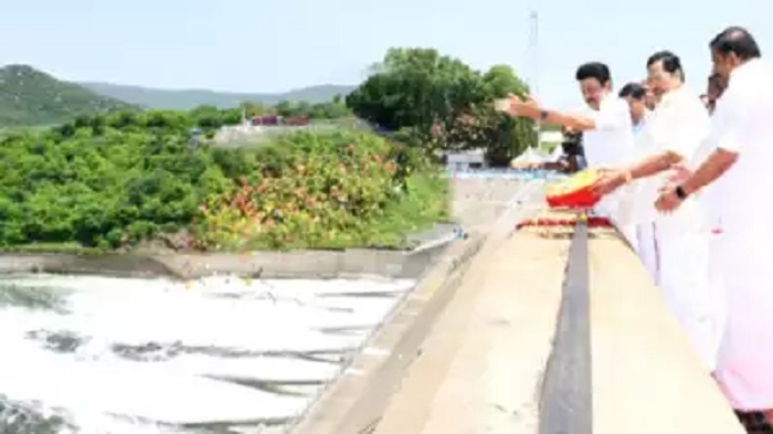 நீர்வளத்துறை அமைச்சர் துறைமுருகன், நகராட்சி நிர்வாகத்துறை அமைச்சர் கே.என்.நேரு ஆகியோருடன் இணைந்து காலை 11.13 மணியளவில் அணையின் மதகுகளை முதல்வர் திறந்து வைத்திருக்கிறார்.