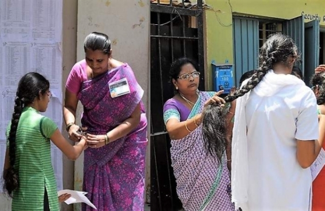 பின் மாணவிகள் அணிந்திருந்த கம்மல், மூக்குத்தி, கொலுசு, துப்பட்டா, அனைத்தும் அகற்றப்பட்டன, மற்றும் மாணவிகளின் தலை முடிகளை களைத்து, தலையில் அணிந்திருந்த கிளிப், ஹேர்பேண்ட் கலட்டப்பட்டு பெற்றோர்களிடம் கொடுக்கப்பட்டது. இத்தனை கடுமையான சோதனைக்குப் பிறகே மாணவர்கள் அனைவரும் தேர்வு மையத்துக்குள் அனுப்பப் பட்டார்கள். ஆதார் அட்டை கொண்டு வராதவர்களையும், தாமதமாக வந்த மாணவர்களையும் தேர்வு எழுத அனுமதிக்க வில்லை.